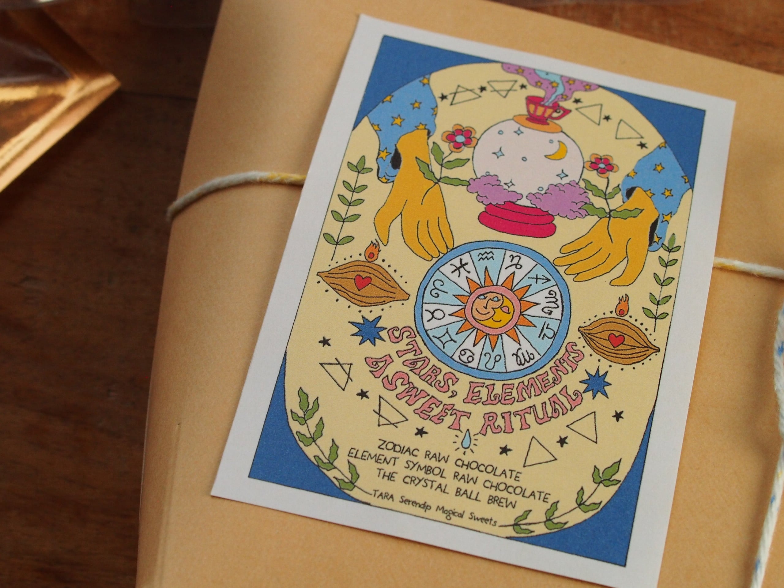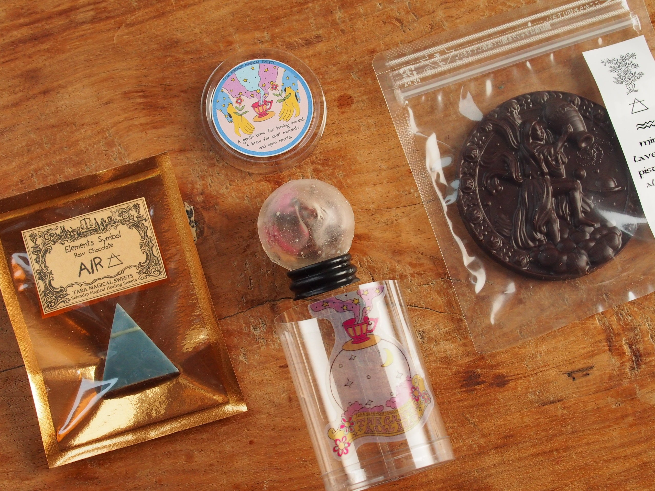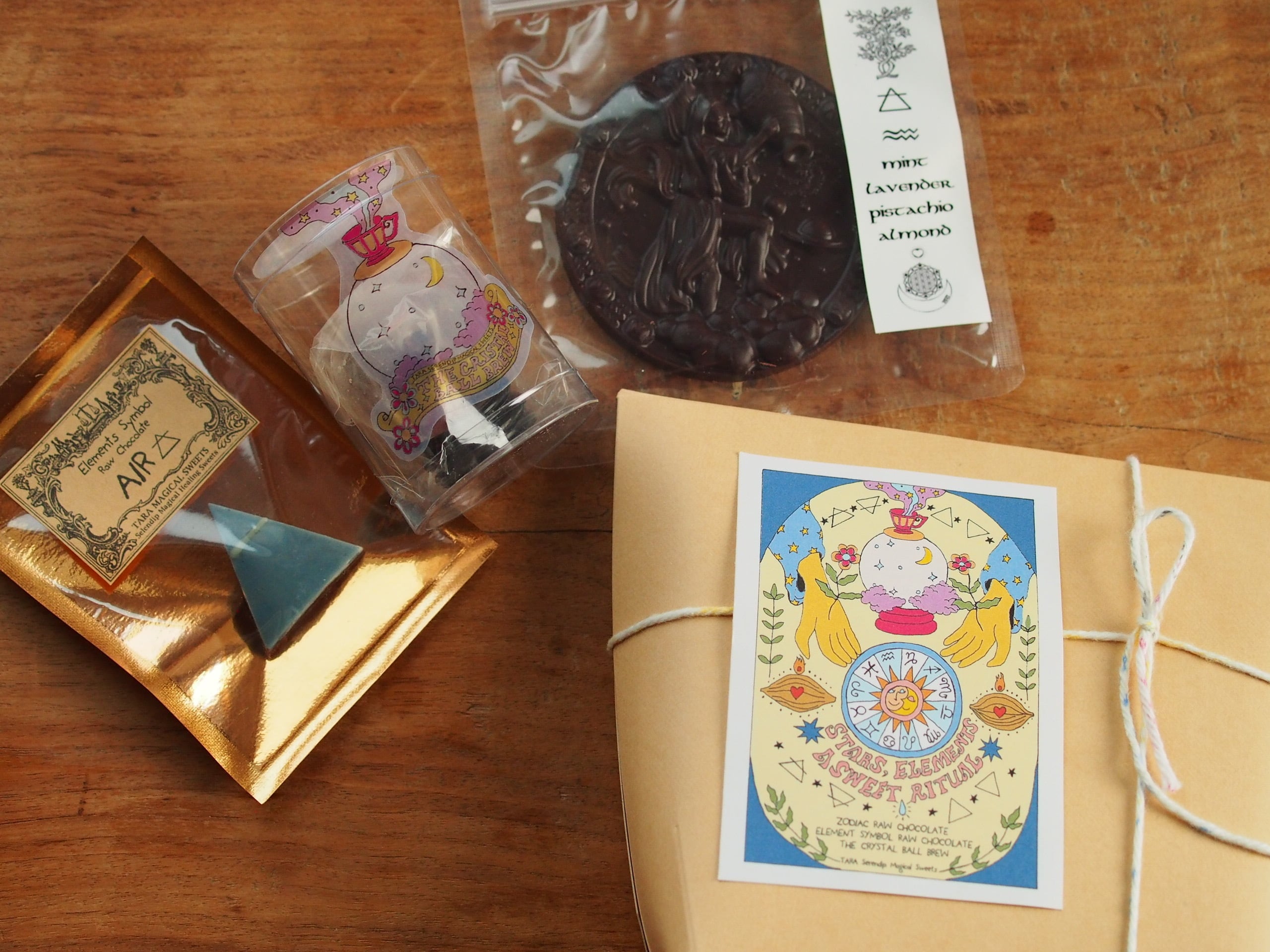 あなたの星座のチョコレートと、星座に対応するひとつのエレメントをテーマにしたローチョコレート、そして水晶玉をイメージしたティーボムを詰め合わせたリチュアルセット。